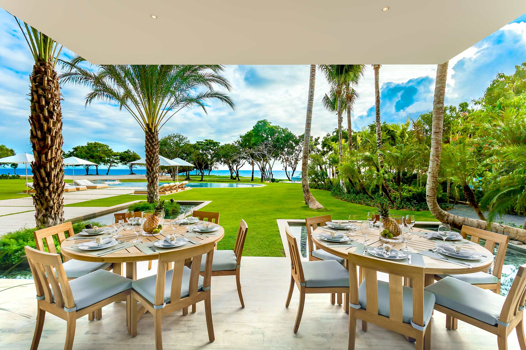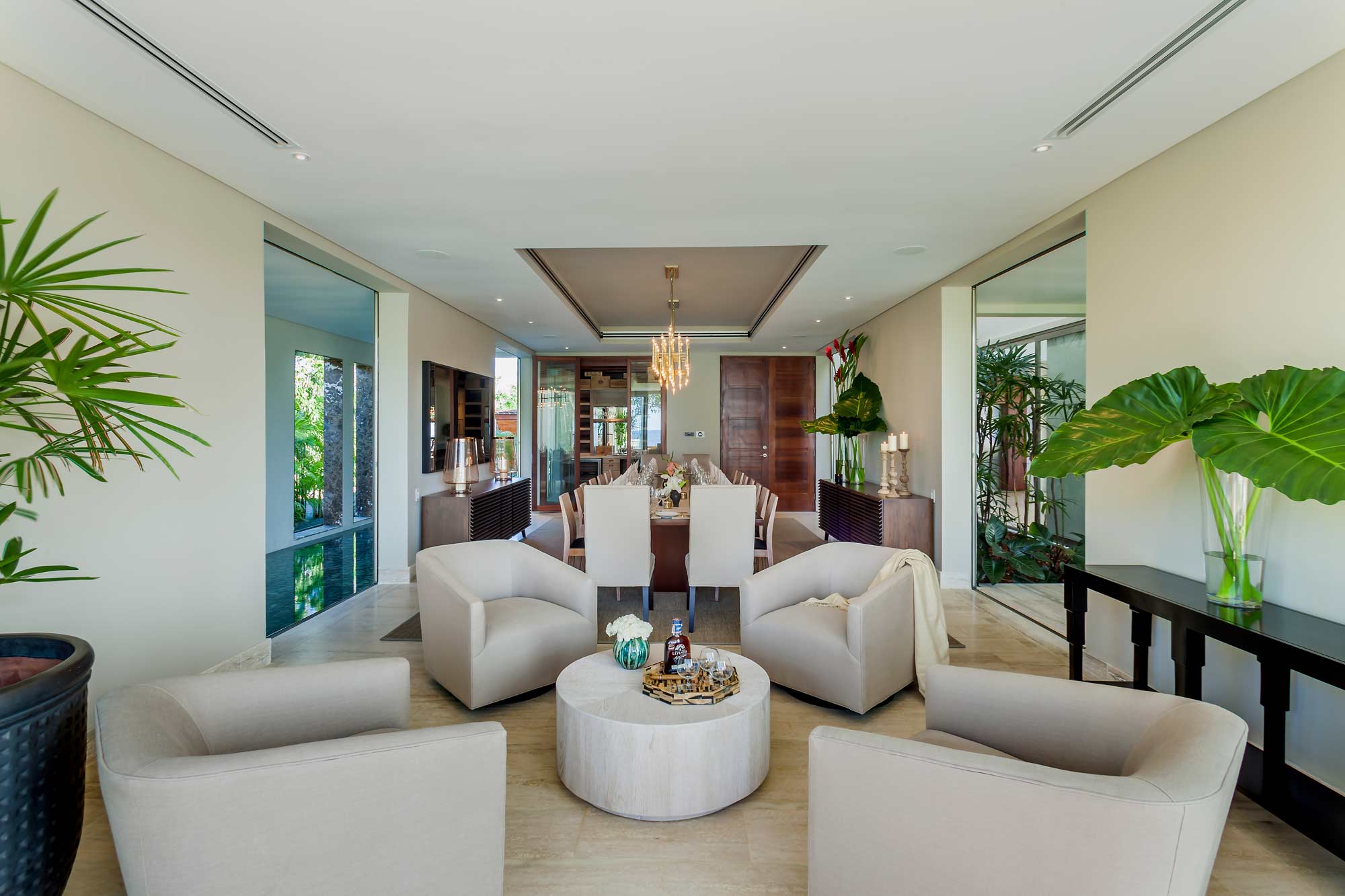 Gather together in the Grand Living Room to plan your day in paradise - it always feels warm and inviting. With its minimalist aesthetic and a Caribbean flavor, this airy space exudes sophistication and elegance with a magnificent 20-foot native wood sculpted vault ceiling, and impressive views of the pool and the Caribbean Sea.